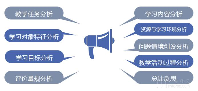 进行信息化教学设计需要遵循以下基本流程:①教学任务分析、②学习对象特征分析、③学习目标分析、④评价量规、⑤学习内容分析、⑥资源与学习环境分析、⑦问题情景创设、⑧教学活动过程分析、⑨总结反思。