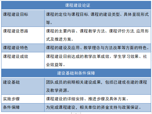 再者,需要进行课程建设论证、建设基础和条件保障等内容的阐述,该部分涵盖的要求较多,包括课程建设目标、建设思路、建设成效、建设基础、实施过程以及条件保障等内容。对于该部分内容的描述一定要详略得当,突出重点内容,叙述逻辑要清晰明了,建议可以通过分层分点进行描述,同时适当运用图表如流程图和逻辑图进行辅助说明。