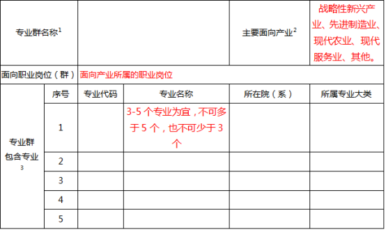 第三,面向产业建议填写战略性新兴产业、先进制造业、现代农业、现代服务业,这些产业是国家大力鼓励与支持,高水平专业群的建设应当往这些产业靠拢建设,避免填写“其他”产业。注意到,专业群应包含3-5专业。