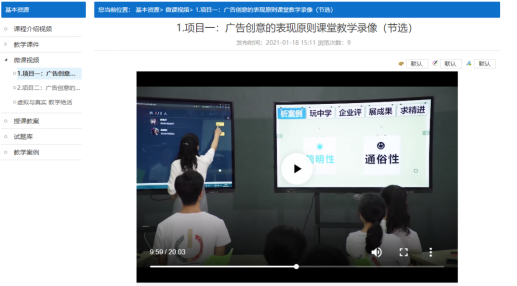 《广告策划与创意文案》课程的基本资源包括了教学课件、教学视频、授课教案、试题库和教学案例,有力支撑了教学目标的实现。学生在观看完教学教学课件和视频后,可以在相应的试题库做课后练习,有利于学生课后巩固知识点。