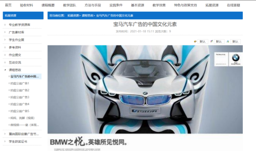 拓展资源包括广告素材库、课程思政,学生作业展等,设置广告素材库有助于学生将课堂所学的知识点和实际案例相结合,做到理论联系实际。在学生作业展、作业提交和互动交流等模块,同学们之间可以相互学习交流,还可以反馈学习问题给老师,老师也能及时获得教学反馈。