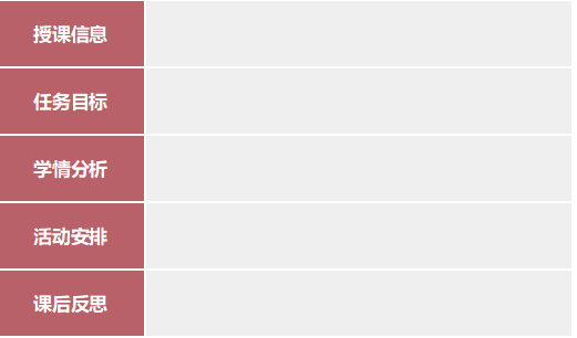 选取一个学期中的教学任务进行教案的撰写,注意,每份教案的教学内容不超过2学时,实践性教学环节的教学内容可以不超过4学时。教案内容包括授课信息、任务目标、学情分析、活动安排、课后反思等教学基本要素。小编建议运用表格形式,让教案看起来更专业有条理。