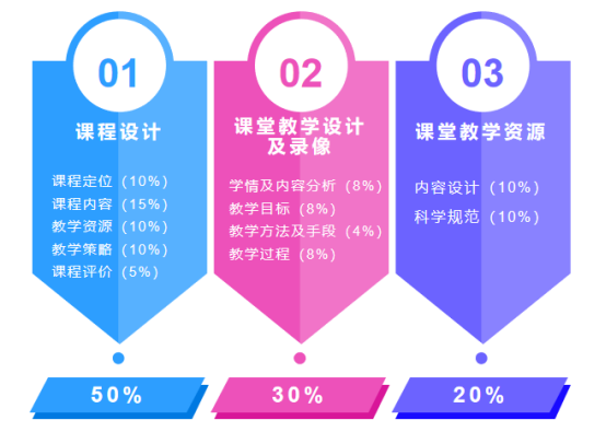 在网络评审环节,课程设计占比50%,课堂教学设计及录像占比30%,课堂教学资源占比20%。根据占比情况,我们可以看出课程设计占比分数较高,因此,在网络评审环节,老师要侧重课程设计内容。当然,课堂教学设计及录像和课堂教学资源也不要疏忽,以确保能顺利通过网络评选。