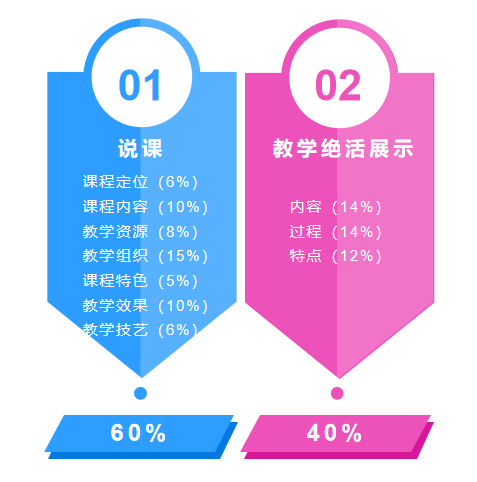 决赛中说课占比60%。现场绝学展示占比40%。因此,在赛前老师要依据比赛的评分标准来制作说课内容,将拿分点清晰的展示出来。还要提前熟悉好说课内容,以便到时现场决赛时能顺畅流利地表达。现场绝学展示占比也不少,要注意与专业的契合度、具有创新性。建议老师提前预演,提高流畅度。
