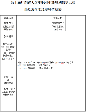 此外,还需要提交课堂教学实录视频信息表、与课堂教学实录视频内容对应的教案。课堂教学实录视频信息表要按规定的表格填写,形式如下: