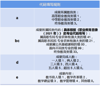 成果代码的组成形式为:abcde,应按照以下规定填写类别代码。例如,若成果属于高等职业教育专科专业农林牧鱼大类,完成人数共有2人,成果内容属于教学改革,则对应的a为1,bc为41,d为2,e为2,因此成果的代码为14122。