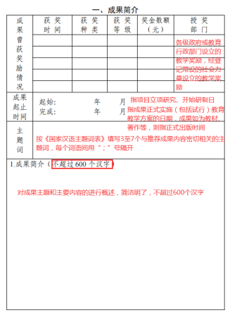 起始时间指立项研究、开始研制日期,完成时间指成果正式实施(包括试行)教育教学方案的日期,如果成果为教材、著作等出版物的,则指正式出版时间;主题词根据《国家汉语主题词表》填写 3 至 7 个与推荐成果内容密切相关的主题词,每个词语间用“;”即分号隔开;成果简介是对成果主题和主要内容进行概述,字数一般不超过 600 个汉字。