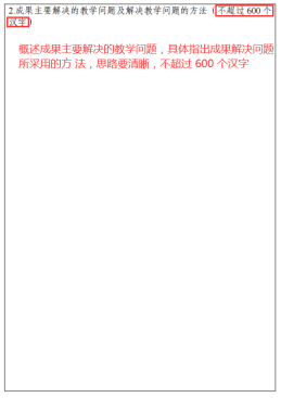成果主要解决的教学问题及解决教学问题的方法主要是概述成果主要解决的教学问题,具体指出成果解决问题所采用的方法,思路要清晰,字数不超过 600 个汉字。