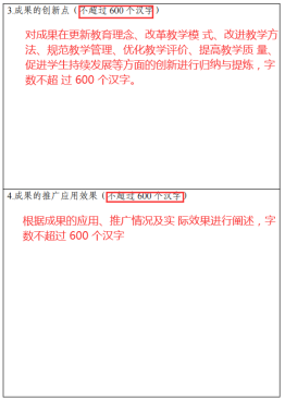 其次,在填写推荐书第一大部分的成果简介时,成果曾获奖励情况是各级政府或教育行政部门设立的教学奖励,高职类成果包括学校设立的教学奖励,经登记常设的社会力量设立的教学奖励,但不包括商业性的奖励。