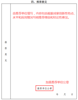 最后,推荐书第四部分的推荐意见由推荐单位填写,可根据成果创新性特点、水平和应用情况写明推荐理由和结论性意见,填写完毕应加盖推荐单位公章。