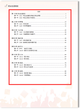 首先是封面,封面图的设计恰当美观,以橙红的暖色调为主,白色为背景,一群穿着学士服和学士帽的学生憧憬新的开始和美好的未来,他们即将毕业离校,进入社会并开始职业生涯,贴合学生自我生涯规划的主题。封面将比赛所需信息整洁地排版出来,让人一目了然。目录设计的以总分结构,层次清晰,简洁明了,展示教案的框架结构。