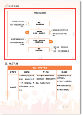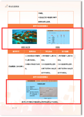 在设计上,每一个子教案均有一个子封面图,框架分割明确,便于专家浏览相对应的教案。教案的内容以竖版的表格形式呈现,表格四周的框线颜色与封面的颜色相呼应,接近主色调,颜色设计恰当,贴合主题。表格式教案规范了教案的格式,归纳总结教案的内容,具有一目了然、言简意赅的特点,不仅便于教师熟记教学内容,还给予专家舒适的浏览感受。在内容中,采用进阶的小表格将教学任务展示出来,突出重点。