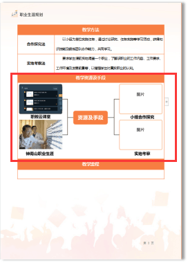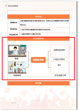 将教学过程采用的信息化资源和手段以图片的形式呈现出来,将信息化手段与教学相结合,将职教云课堂、微课、动画案例、真实案例与课堂教学融合,通过丰富的资源让学生明白职业生涯规划的重要性以及如何规划,体现了课堂教学的改革与创新的特点。