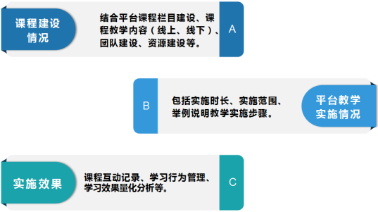 撰写实施报告应选取课程中对混合式教学应用效果突出的部分,应包括以下3个方面的情况。