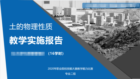 整个教学实施报告运用蓝灰色色调,让PPT的风格极具理性专业的态度,与课程内容“土的物理性质”的相匹配,更贴合主题。蓝色更具严谨平静氛围,使实施报告看起来更有条理。PPT通过精心的美化统一,让人明确程的定位,以便决赛舞台上顺利的汇报。