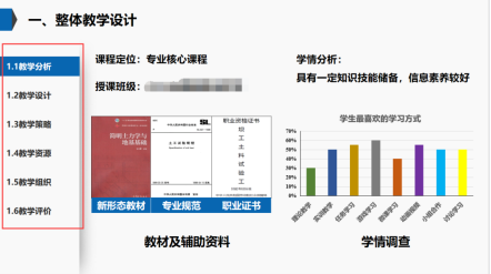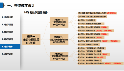 这是高职专业二组16学时的作品,主要定位于隧道专业的学生,介绍土的物理性质课程实施。根据实施报告,整体概括教学内容,包括教学整体设计、教学实施过程、学生学习效果、反思改进措施,突出重点和特色等方面情况。其中教学设计中包教学分析、教学设计、教学组织、教学策略、教学评价等。它建立明晰的目录导航栏,使整个教学实施报告的讲解更有逻辑性,让人一目了然。