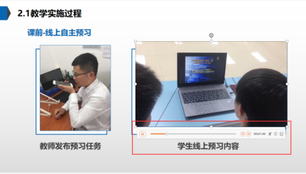 教学实施过程部分,总结性描述了16学时的实施情况。它利用简短的课程视频,介绍学生线上的预习内容,展示学习流程,让专家身临其境感受课堂氛围,体验实施效果。注意,视频不宜过大,要用意明确。教学实施部分为汇报的重心,小编建议可稍微多花点心思,可运用2分钟时间来介绍。