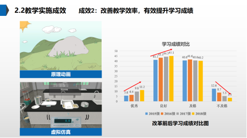 教学效果部分,运用柱状图对比课程改革前后近四年学生的成绩,教学效果提升的幅度,用详细可量化的数据表达,让教学效果更具真实性,客观性。