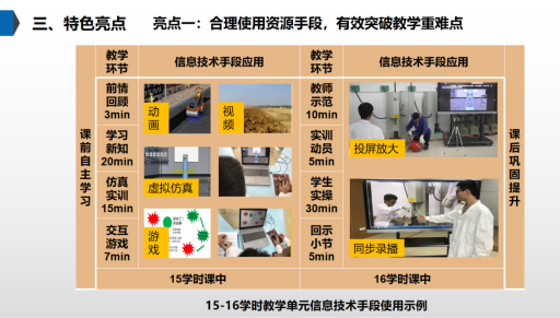 课程特色亮点部分,用经典的例子来分析,着重阐述合理运用动画、视频、虚拟仿真等高新技术手段来辅助教学的实施,充分展现课程的优势特色。