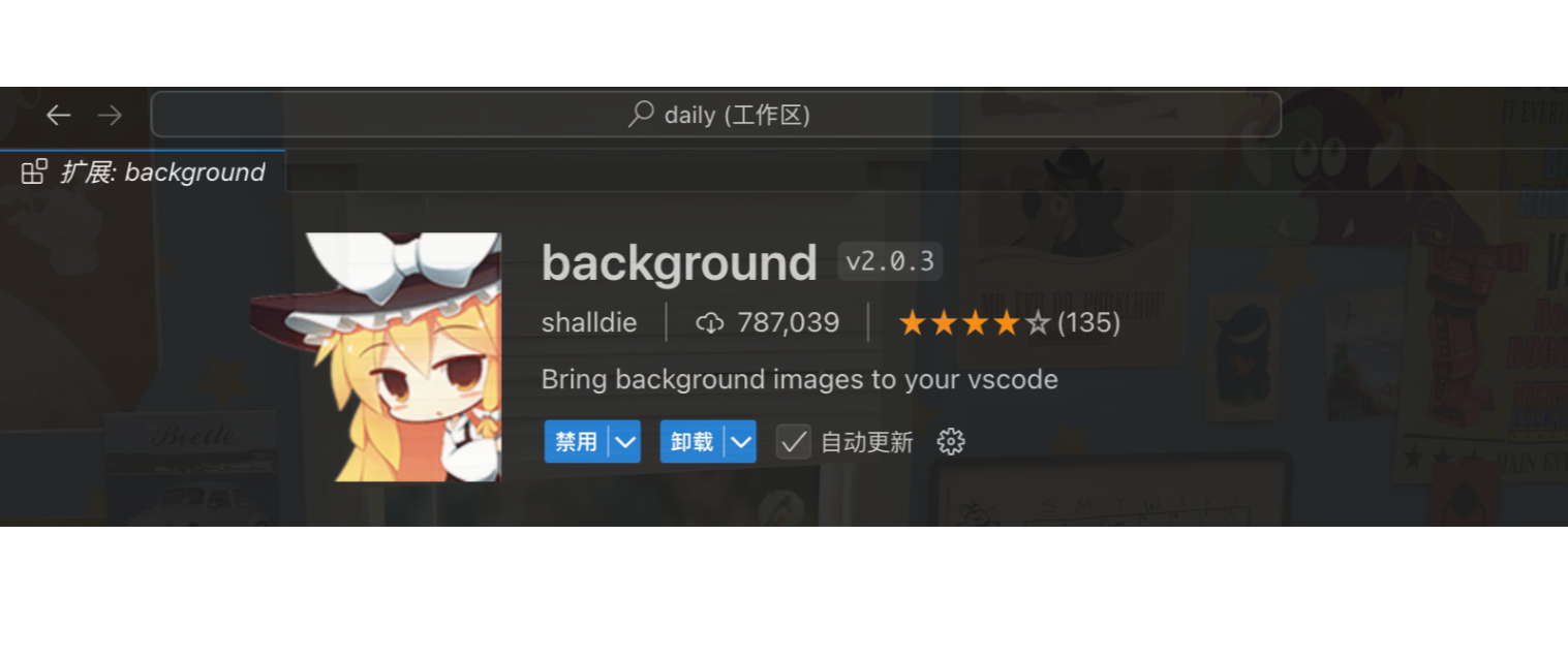 在VsCode编辑器的扩展中心搜索background插件并安装,重启VsCode。