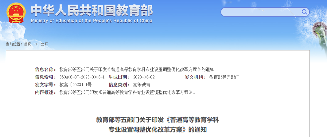五部门印发《普通高等教育学科专业设置调整优化改革方案》
